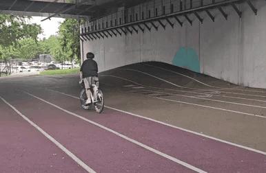 21일 오후 2시 경기 광명시 광명스피돔 인근에서 브레이크가 없는 픽시를 처음 타 보고 있는 기자의 모습. 서행 상태에서 정지를 시도했음에도 균형을 잡지 못해 발을 땅에 디딜 수밖에 없었다. 오세운 기자 |