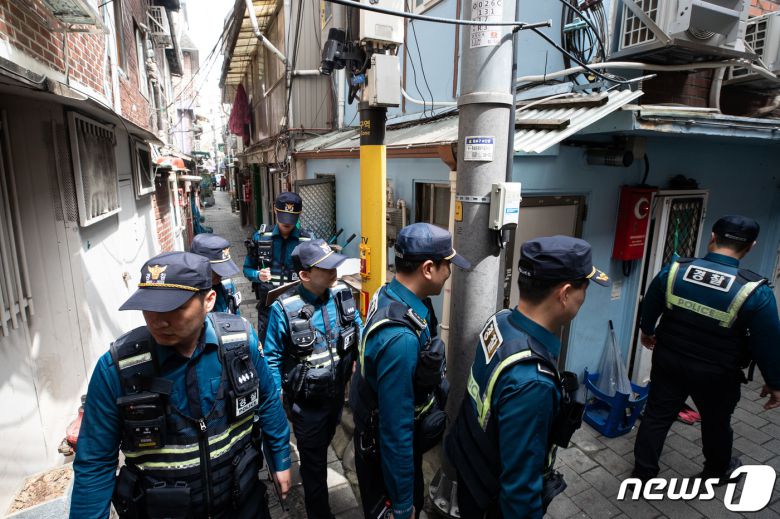 서울경찰청 기동순찰대가 지난해 4월 16일 서울 종로 쪽방촌 일대를 순찰하고 있다. 2024.4.17/뉴스1 ⓒ News1 유승관 기자 |