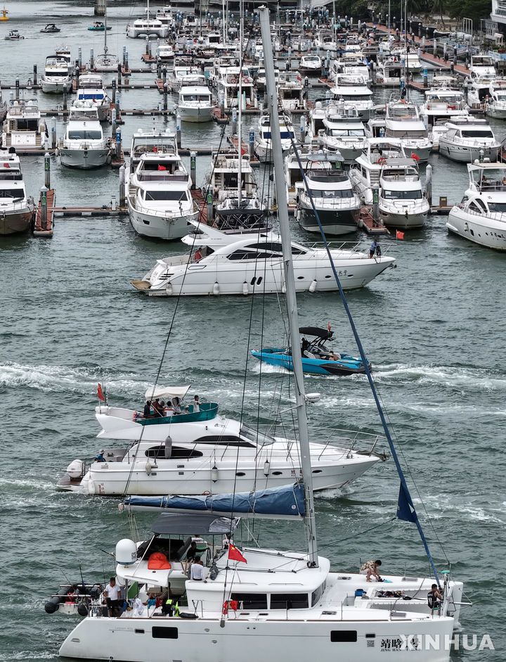[ 산야 (중국)= 신화/뉴시스] 8월 23일 중국 하이난성의 항구도시 산야의 항만에서 제 13호 태풍 카지키의 상륙에 대비해 대피한 선박들을 촬영한 항공사진. 중국 기상청은 카지키에 대비해 하이난 성 일대에 태풍과 홍수 경보를 발령하고 주민들을 미리 대피시켰다. 2025. 08. 24. |