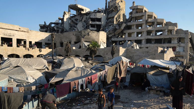 ▲ 현지시간 23일 팔레스타인 주민들이 이스라엘의 공습과 지상 작전으로 파괴된 건물 옆에 위치한 임시 텐트 캠프 옆에 서 있다.