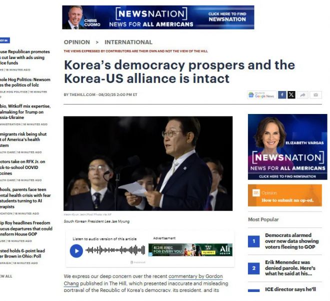 주미 한국대사관이 지난 20일(현지시간) 미국 매체 더힐에 실은 고든 창 변호사 칼럼에 대한 반박 기고문. 더힐 홈페이지 캡처 |