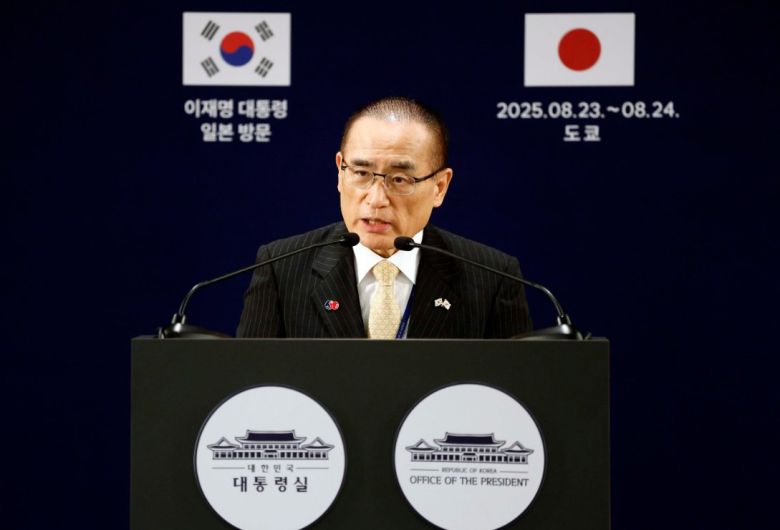 위성락 국가안보실장이 24일 오전 일본 도쿄의 한 호텔에 마련된 한국 프레스센터에서 한일정상회담 결과에 대한 브리핑을 하고 있다. 2025.8.24 대통령실사진기자단 |