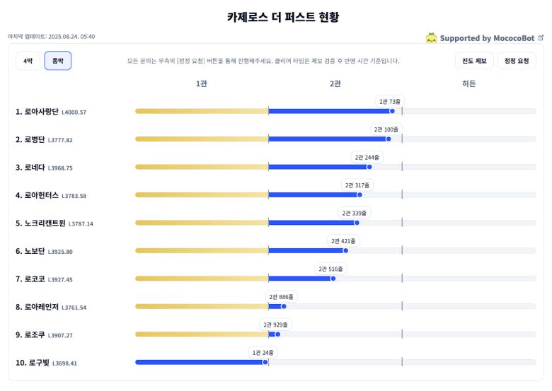 이에 2관문을 통과한 공격대의 진도에 많은 이목이 집중됐다. 다만 LOPEC에서는 미공개 상태인 일반인 공격대라서 정확한 진도 확인은 불가능한 상태다. LOPEC 기준으로는 로아사랑단(캡틴잭, 쫀지, 쁘허, 태경, 방울토마토라면, 김뚜띠, 후니, 은가비)이 73줄로 선두를 달리고 있으며 로조쿠까지 총 9개의 공격대가 2관문에 돌입했다.