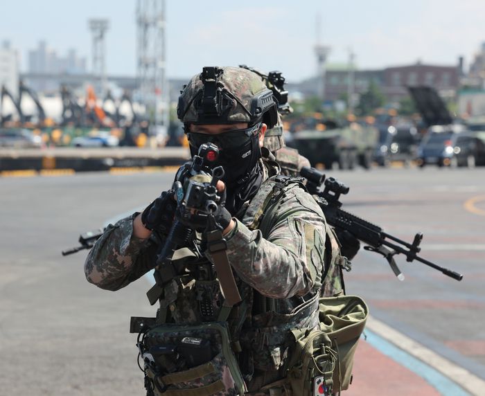 지난 20일 울산항 5부두 일대에서 열린 ‘사이버 위기대응과 연계한 울산항 통합방호훈련’에서 군이 경계 태세를 갖추고 있다. 기사 내용과 직접적인 관련 없음. [사진 출처 = 연합뉴스] |