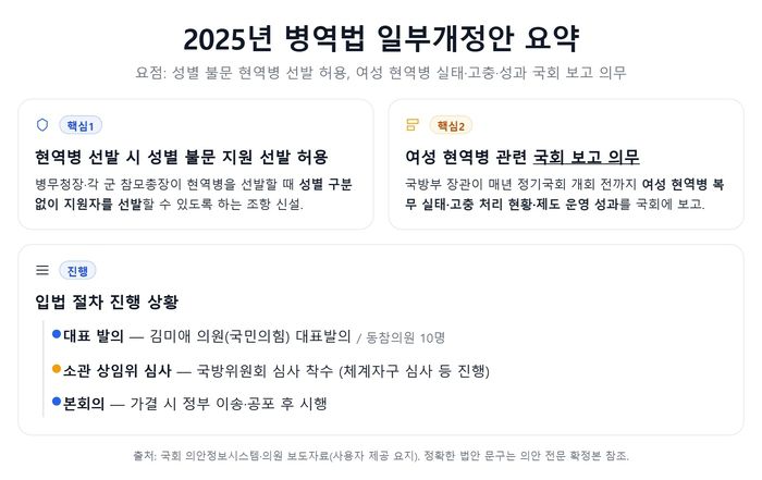 이 법안은 병무청장이나 각 군의 참모총장이 현역병을 선발할 때 성별 구분 없이 지원자를 선발하도록 하는 내용이 골자다. 국방부 장관이 여성 현역병 복무 실태와 고충 처리 현황 및 제도 운용 성과를 매년 정기 국회 개회 전까지 국회에 보고하게끔 하는 내용도 포함됐다.
