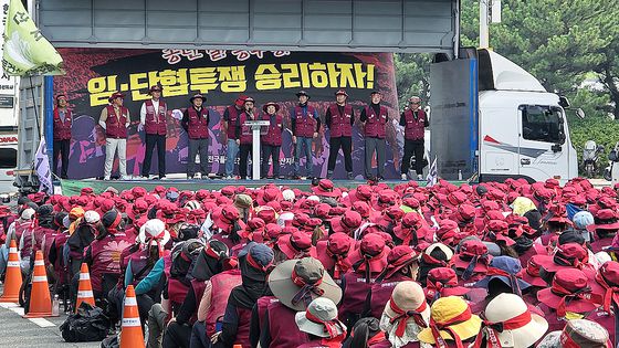 지난 8일 울산 울주군 에쓰오일 샤힌프로젝트 건설현장 앞 주도로에서 건설플랜트노조 울산지부 조합원 9000여명이 임단협 관련 성실교섭을 요구하며 부분파업 집회를 벌이고 있다. 이날 집회에선 노조 교섭 대상인 하청업체 뿐 아니라 발주처인 에쓰오일을 향해서도 ″책임감 있게 나서라″는 구호가 나왔다. 울산=나상현 기자 |