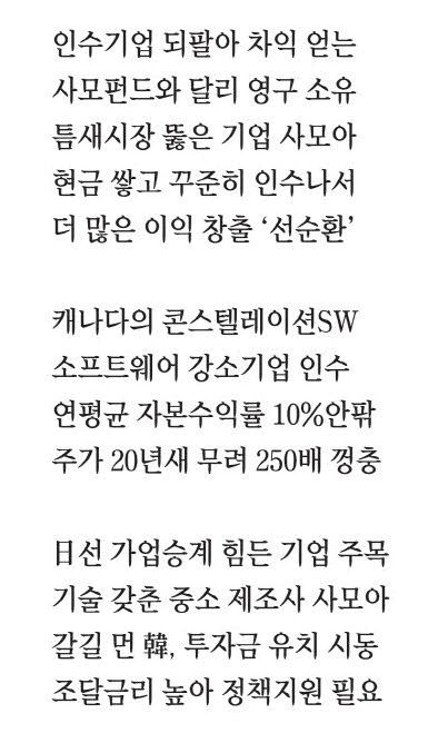 저말 박시 CFO는 "아직 사모펀드가 연 매출 500만달러 수준의 소규모 기업까지 인수하진 않고 있다"고 말합니다. 사모펀드 특성상 중견기업 반열에 오른 기업을 인수하고, 인수 기업을 키워서 되파는 전략을 쓰는데, 강소기업은 이에 맞지 않는다는 이야기입니다.