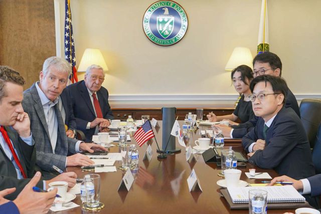 24일 산업통상자원부에 따르면 여한구 통상교섭본부장이 지난 21일(현지시간) 제이미슨 그리어 미국무역대표부(USTR) 대표와 회동한 데 이어 22일 김정관 장관이 미국 워싱턴DC 에너지부 회의실에서 크리스 라이트 에너지부 장관과 만나 한·미 양국 간 에너지 협력 강화 방안을 논의했다. 김 장관은 이 자리에서 원자력협정 개정과 관련된 문제도 조율한 것으로 알려졌다.