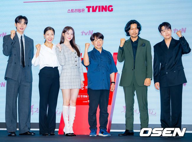 [OSEN=민경훈 기자] 19일 오후 서울 신도림 디큐브시티 내 더 세인트에서 tvN새 토일드라마‘폭군의 셰프’(연출 장태유) 제작발표회가 진행됐다.오는 23일 첫 방송 예정인 ‘폭군의 셰프’는 최고의 순간 과거로 타임슬립한 셰프(임윤아)가 최악의 폭군이자 절대 미각의 소유자인 왕을 만나며 벌어지는 서바이벌 판타지 로맨틱코미디 드라마이다.이채민, 서이숙, 임윤아, 장태유 감독, 최귀화, 오의식이 입장하며 포즈를 취하고 있다. 2025.08.19 /rumi@osen.co.kr |