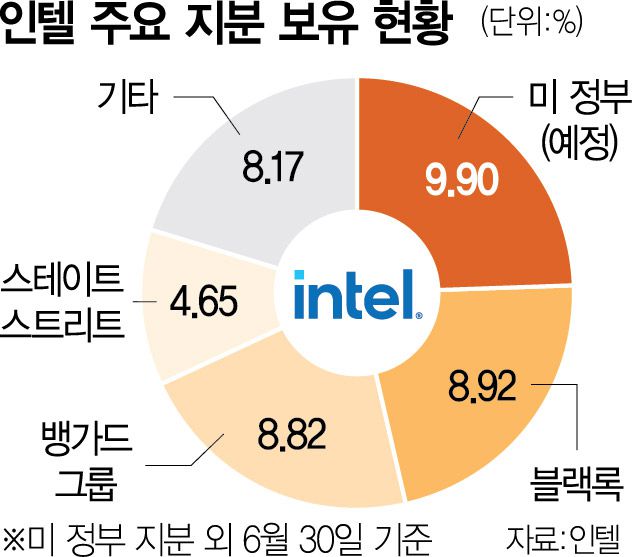 트럼프 대통령은 22일(현지 시간) 소셜네트워크서비스(SNS) 트루스소셜에 “미국이 이제 더 놀라운 미래를 가진 위대한 미국 기업 인텔의 (지분) 10%를 완전히 소유하고 통제한다고 보고 드리게 돼 큰 영광”이라고 밝혔다. 이어 “인텔이 하는 일인 최첨단 반도체와 집적회로를 만드는 것은 우리나라 미래의 근간”이라며 “다시 미국을 위대하게 만들자”라고 적었다. 미 정부가 획득한 인텔 지분율은 9.9%로 기존 최대주주인 블랙록(8.92%)보다 약 1%포인트 높다.