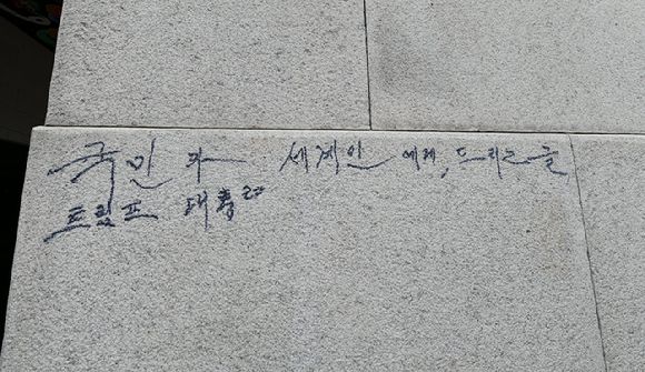 당시 김씨는 석축의 무사석(武沙石·홍예석 옆에 층층이 쌓는 네모반듯한 돌)에 검은 매직으로 '국민과 세계인에 드리는 글'이라고 쓴 뒤 그 아래에 '트럼프 대통령'이라고 쓰다가 적발됐다.