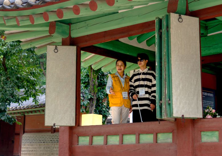 현장영상해설사(왼쪽)와 시각장애인 참가자가 궁궐을 둘러보고 있다. 서울관광재단 제공