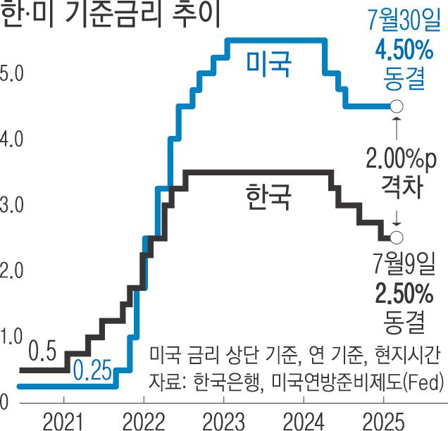 반면 한은이 선제적 조치보다는 미국의 금리 인하 단행 뒤에야 나설 것이란 전망도 많다. 주원 현대경제연구원 경제연구실장은 “한은은 미국과의 금리 차를 상당히 우려하는 스탠스로 보인다”며 “미국이 9월쯤 금리를 내리면 부담이 줄어드니 10월쯤 한 번 내릴 것으로 본다”고 말했다.