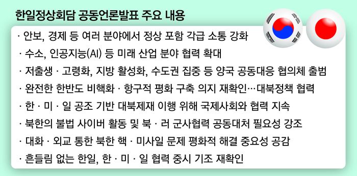 이외에도 △수소·인공지능(AI) 등 미래산업 협력 확대 △저출생·고령화, 지방 활성화 등 공동 대응 △북한 핵·미사일 위협에 한·미·일 공조를 바탕으로 한 협력 지속 등 양국의 협력 방안이 담겼다.