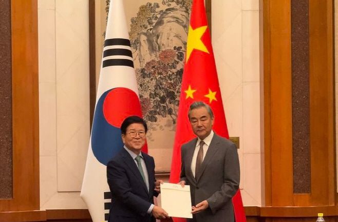 24일 중국 베이징에 도착한 이재명 대통령의 특사단이 첫 일정으로 왕이 중국 당 정치국 위원 겸 외교부장과 회동이 대통령의 친서를 전달했다. 특사단장인 박병석 전 국회의장이 전달하고 있다./베이징특파원 공동취재단. |