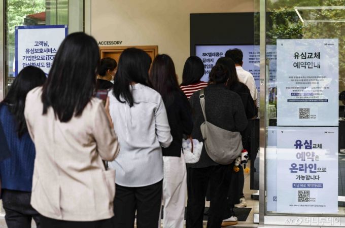 [서울=뉴시스] 김근수 기자 = 20일 서울 시내의 한 SK텔레콤 직영점에서 소비자들이 유심 교체 관련 상담을 받기 위해 줄 서 있다. SK텔레콤이 3년 전부터 해커의 악성코드 공격을 받아 총 23대 서버에서 유심 및 개인정보가 유출된 것으로 확인됐다. 유출된 정보는 가입자 식별번호(IMSI), 단말기 식별번호(IMEI), 이름, 생년월일 등으로, 사실상 전 가입자의 정보가 포함된 규모다. 정부는 SKT에 즉각적인 피해 예방 조치를 요구했으며, 개인정보보호위와 함께 정밀 분석을 진행한다고 밝혔다. 2025.05.20 /사진=김근수 |