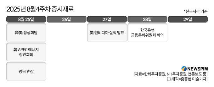 [서울=뉴스핌] 이나영 기자= 이번 주(25~29일) 국내 증시는 한미 정상회담과 잭슨홀 미팅 여진, 한국은행 금통위를 앞두고 정책 방향성과 수급 흐름을 가늠할 전망이다. 대미 협력 기대가 반영된 조선·방산·원전 업종에 단기 수급이 유입될 수 있지만, 변동성 확대에 대한 경계도 이어지고 있다.