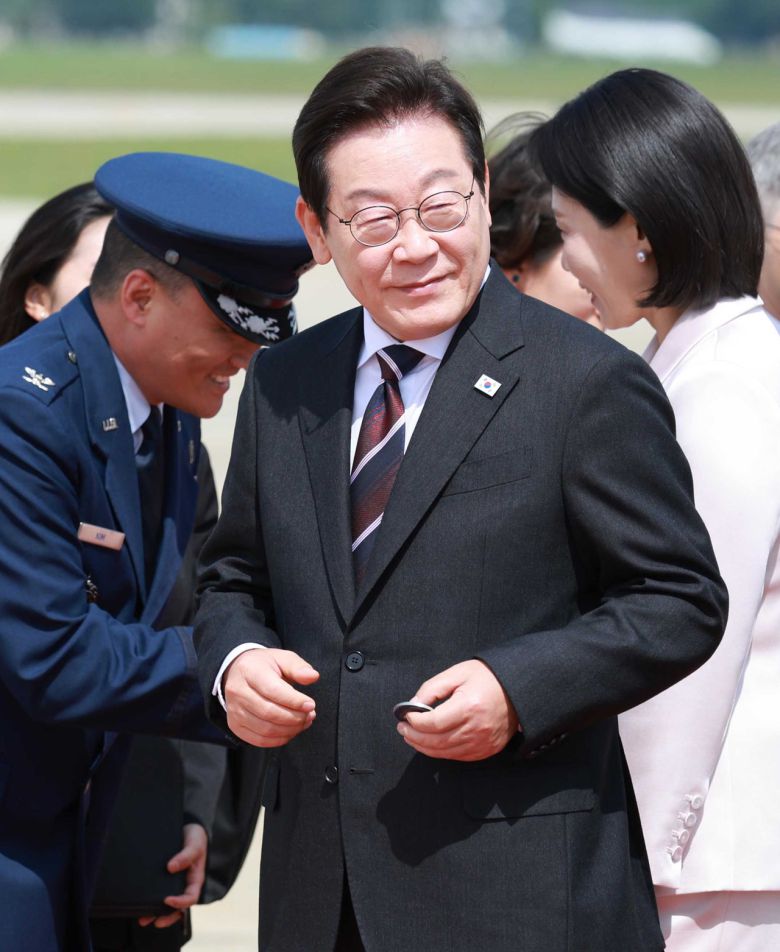 취임 후 처음 미국을 방문한 이재명 대통령이 24일(현지시간) 미국 워싱턴DC 인근 앤드루스 합동기지에 도착해 공군1호기에서 내려 영접 인사로 나온 미국 측 조슈아 킴 대령으로부터 기지 방문 기념 코인을 받아 들고 있다. [연합]