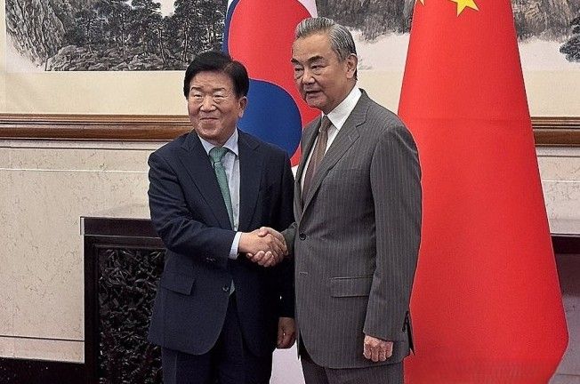 이재명 대통령 특사단장인 박병석 (왼쪽) 전 국회의장과 왕이 중국공산당 중앙외사판공실 주임 겸 외교부장이 지난 24일 베이징에서 만나 악수하고 있다. 베이징특파원 공동취재단