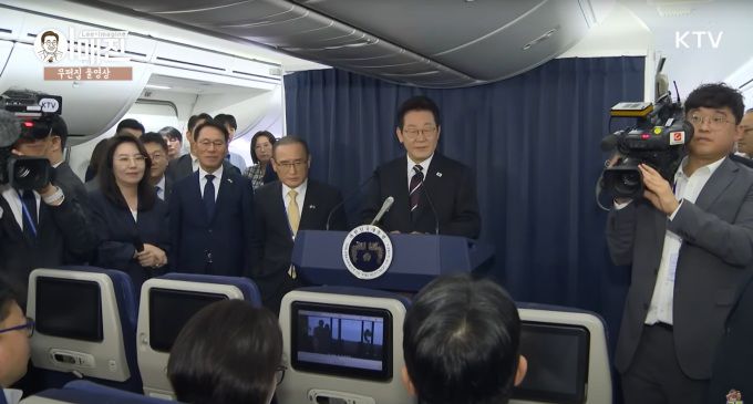 이재명 대통령이 24일(현지시간) 일본 방문을 마치고 미국으로 향하는 전용기에서 동행 취재진과 기자간담회를 하고 있다. [사진=KTV] |