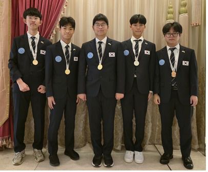 제18회 국제천문 및 천체물리올림피아드에서 한국대표단이 금메달 3개·은메달 1개·동메달 1개를 획득했다. 한국대표단 메달 시상식 기념 촬영 모습. (왼쪽부터) 정태훈, 오승민, 민지호, 유찬영, 이용건 학생. (과기정통부 제공) |