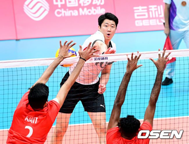 [OSEN=항저우(중국), 최규한 기자] 20일 오후 중국 항저우 린핑 스포츠센터에서 ‘제19회 항저우아시안게임’ 남자배구 C조 조별리그 1차전 대한민국과 인도의 경기가 열렸다.1세트, 한국 나경복의 공격이 네트에 걸리고 있다. 2023.09.20 / dreamer@osen.co.kr |