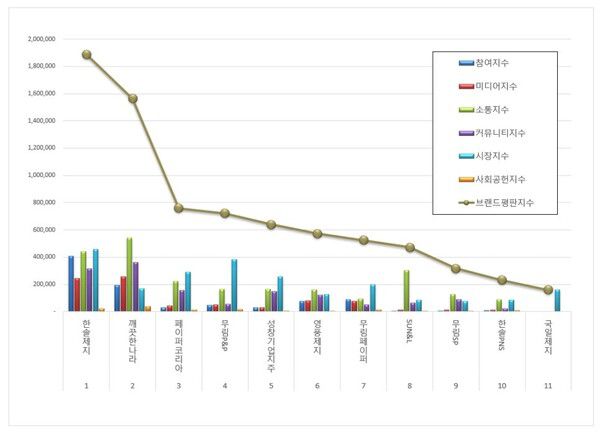 2위, 깨끗한나라 브랜드는 참여지수 193,237 미디어지수 258,345 소통지수 540,441 커뮤니티지수 363,421 시장지수 167,746 사회공헌지수 39,894가 되면서 브랜드평판지수 1,563,084로 분석됐다. 지난 7월 브랜드평판지수 1,228,170과 비교해보면 27.27% 상승했다.