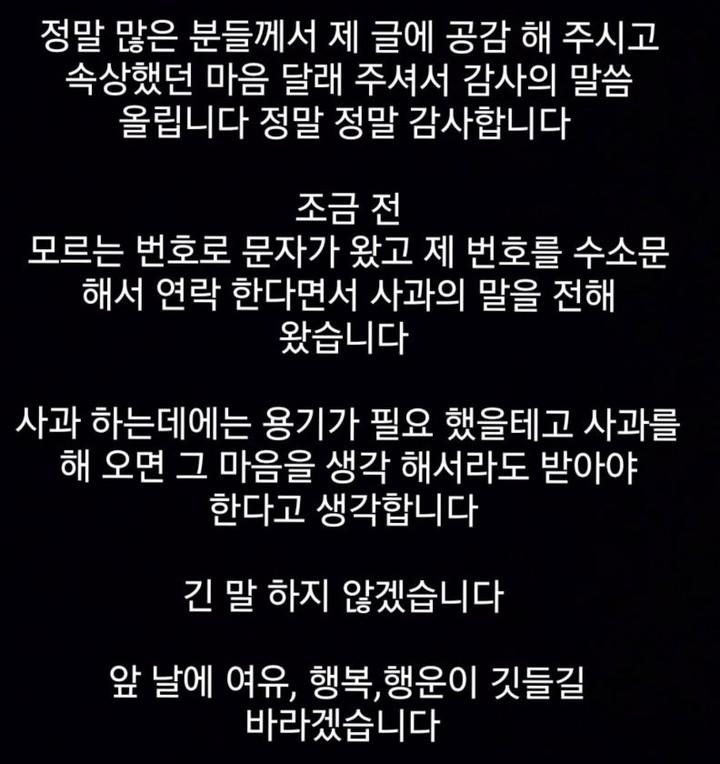 장윤정은 이에 "내 번호를 수소문해서 연락한다며 사과의 말을 전해왔다. 사과에는 용기가 필요했을 테고, 사과를 해오면 그 마음을 생각해서라도 받아야 한다"라며 "앞날에 여유, 행복, 행운이 깃들길 바란다"라고 용서했다.