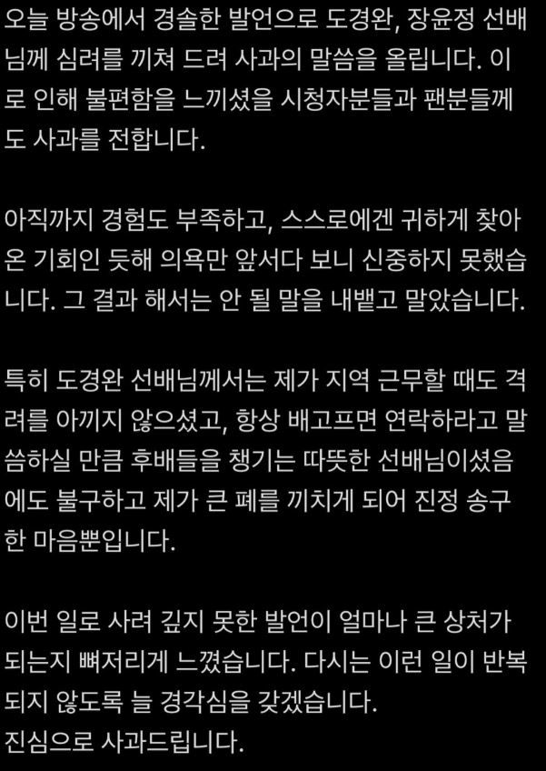 이어 "30대 후반이라는 나이와 아나운서라는 전문직의 무게에도 불구하고, 스스로에게 귀하게 찾아온 기회를 놓치고 싶지 않았다는 핑계로 경험 부족을 언급하며 마치 10대 후반 고등학생과 같은 발언을 했다는 점은 더욱 충격적이다. 아나운서로서 기본적인 언행 관리조차 하지 못한 것은 변명의 여지가 없다"라고 했다.
