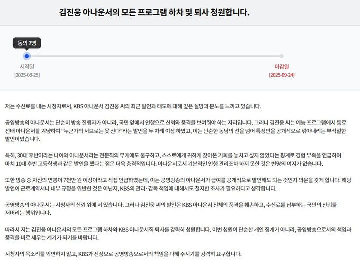그러면서 "공영방송의 아나운서는 시청자의 신뢰 위에 서 있다. 그러나 김진웅의 발언은 KBS 아나운서 전체의 품격을 훼손하고, 수신료를 납부하는 국민의 신뢰를 저버리는 행위다"라며 "김진웅 아나운서의 모든 프로그램 하차와 KBS 아나운서직 퇴사를 강력히 청원한다. 이번 청원이 단순한 개인 징계가 아니라, 공영방송으로서의 책임과 품격을 바로 세우는 계기가 되기를 바란다"라고 요구했다.