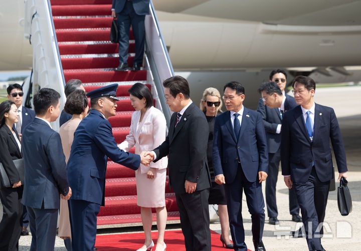 [워싱턴=뉴시스] 고범준 기자 = 한미 정상회담을 위해 미국을 방문한 이재명 대통령과 김혜경 여사가 24일(현지 시간) 워싱턴DC 앤드루스 공군기지에 도착해 조슈아 킴 대령과 악수하고 있다. (공동취재) 2025.08.25. bjko@newsis.com |