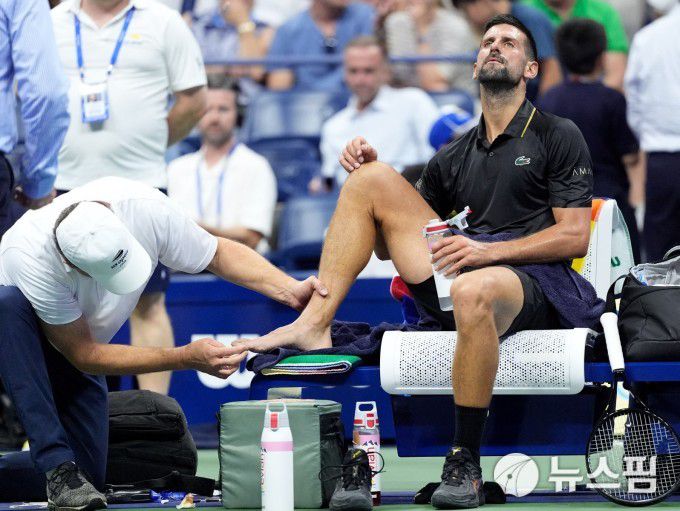 [뉴욕 로이터=뉴스핌] 박상욱 기자= 조코비치가 24일(현지시간) US오픈 남자 단식 1회전 도중 메디컬 타임아웃을 불러 발가락 부위를 점검받고 있다. 2025.08.24 psoq1337@newspim.com |
