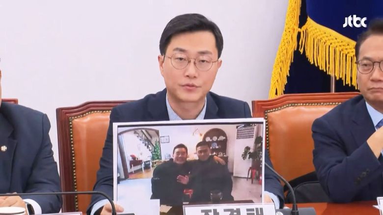 [장경태/더불어민주당 의원 : 순직해병 특검팀이 임성근 전 사단장과 임성근의 구명루비 참고로 지목된 멋쟁해병 단톡방 멤버 송호종의 국회 위증 정황을 포착했습니다. 임성근과 송호종은 지난해 10월 14일 공수처 국정감사에 출석해 증인 선서를 하고 고의로 허위 진술을 한 것이 드러났습니다. 당시 제가 임성근과 송호준에게 23년 연말에 만났다는 제보를 받아 만난 적이 없냐고 물었을 때 이 둘은 만난 적이 없다고 대답했었습니다. 이 사진은 특검팀이 송호준의 휴대전화에서 발견한 두 사람의 사진입니다. 23년 12월 23일 17시에 경기도 수원의 한 카페에서 임성근과 송호준이 어깨동무를 하고 아주 친근한 표정으로 사진을 찍었습니다.]