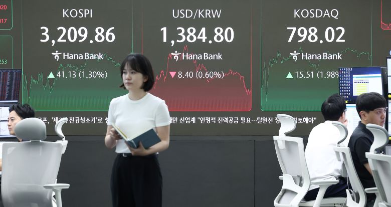 25일 서울 중구 하나은행 딜링룸 전광판에 종가가 표시되고 있다. 이날 코스피 지수는 1.30% 상승한 3209.86로 마감했다. 코스닥 지수도 1.98% 상승해 798.02로 거래를 마쳤다./뉴스1 |