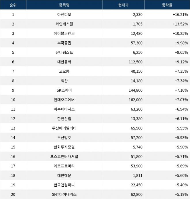 6위 대한유화(006650)는 종가 112,500원으로 9.12% 상승 마감했다. 7위 코오롱(002020)은 종가 40,150원으로 7.35% 상승 마감했다. 8위 백산(035150)은 종가 14,180원으로 7.34% 상승 마감했다. 9위 SK스퀘어(402340)는 종가 144,800원으로 7.10% 상승 마감했다. 10위 현대오토에버(307950)는 종가 162,000원으로 7.07% 상승 마감했다.