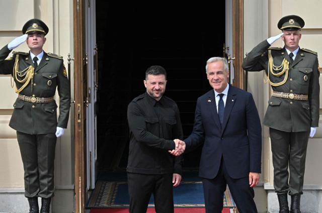 24일 우크라이나의 독립 34주년을 축하하기 위해 키이우를 찾은 마크 카니(오른쪽) 캐나다 총리가 볼로디미르 젤렌스키 우크라이나 대통령과 악수하고 있다. AFP 연합뉴스 |