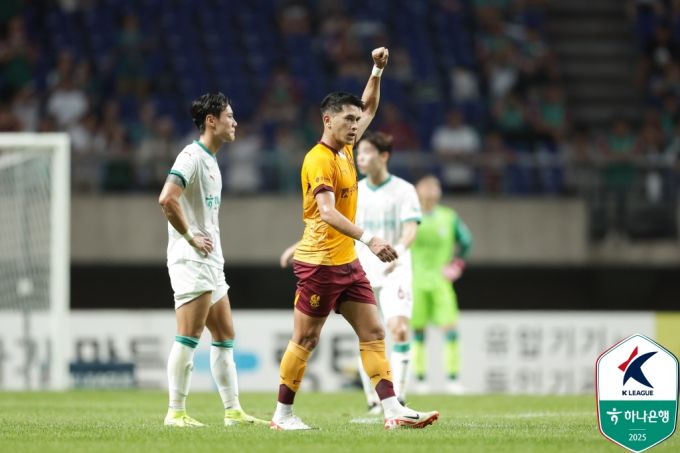 [서울=뉴스핌] 장환수 스포츠전문기자= 광주 헤이스가 17일 대전과 홈경기에서 전반 26분 선제골을 넣은 뒤 세리머니를 하고 있다. [사진=한국프로축구연맹] 2025.08.17 zangpabo@newspim.com |
