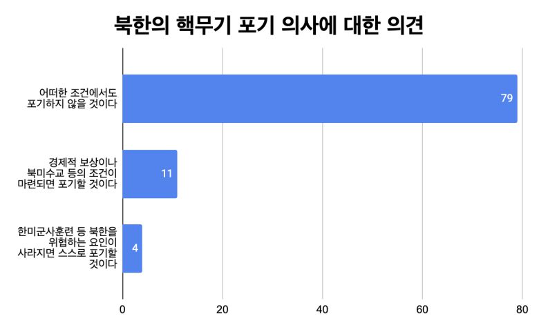 응답자 10명 중 8명은 북한이 핵무기를 절대 포기하지 않을 것이라고 보는 것으로 나타났다. 북한의 핵무기 포기 의사에 대한 질문에 79%가 “어떠한 조건에서도 포기하지 않을 것”이라고 답했다. “경제적 보상이나 북미 수교 시 포기할 것”이라는 조건부 비핵화 가능성은 11%로 더 낮았다. “한미군사훈련 등 위협 요인 제거 시 스스로 포기할 것”이라는 응답은 4%였다.
