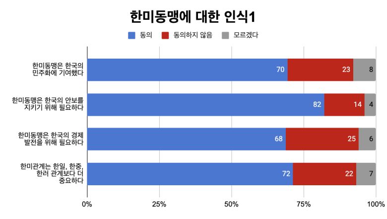응답자들은 한미동맹을 긍정적으로 평가했다. 특히 “한국의 안보를 위해 필요하다”는 데 82%가 동의했다. “한일, 한중 관계 등보다 한미관계가 더 중요하다”는 응답도 72%였다. “한미동맹이 민주화에 기여했다”(70%)거나 “경제발전에 필요하다”(68%)는 평가도 높았다. 안보뿐 아니라 외교, 역사적 측면에서도 한미동맹을 중요하게 보는 여론이 확인됐다.