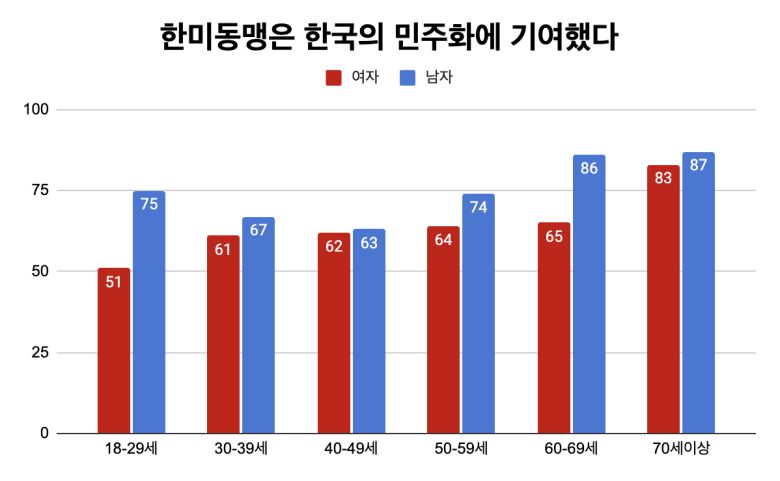 '한미동맹은 한국의 민주화에 기여했다' 동의 응답
