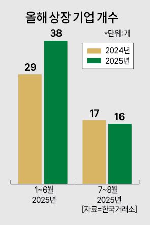 25일 금융투자업계에 따르면 최근 IPO시장은 상반기에 비해 한풀 꺾인 모습이다. 지난해 7~8월 동안 17개 기업이 상장했으나 올해는 같은 기간 16개 기업이 상장하는 데 그쳤다. 상반기에는 38개사(코스피 4개사, 코스닥 34개사)가 상장해, 전년 동기(29개사) 대비 큰 폭으로 증가했으나 하반기 들어서는 확연히 줄어드는 모습이다.