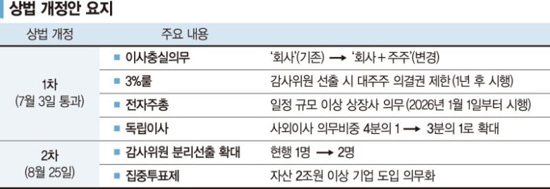 경제 8단체는 25일 여권이 경영권 방어에 대한 안전장치 없이 지난달 3일 1차 상법 개정에 이어 25일 또다시 몰아치기식으로 2차 상법 개정을 처리했다는 점에 강한 유감을 표명했다. 재계는 1·2차 상법 개정에 대응해 배임죄 등 형사처벌 조항 개선, 포이즌필·황금낙하산 등 경영권 방어수단 입법화를 촉구할 방침이나 여권의 시선은 이미 자사주 소각 의무화와 관련된 제3차 상법 개정안(9월 정기국회 상정 예정)에 꽂힌 상태다.