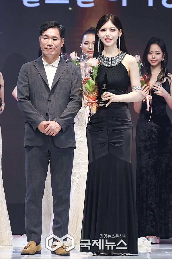 (서울=국제뉴스) 이대웅 기자 = '미스어스 코리아 2025' 선발대회가 지난 20일 오후 서울 강남구 엘리에나호텔에서 열렸다. 이날 시상식에서 글로벌 리더상을 수상한 이정윤이 플래너스디자인그룹 이인재 대표와 함께 기념 포즈를 취하고 있다.