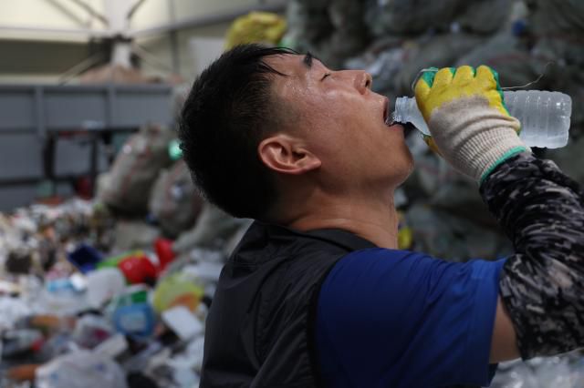 30일 대구 동구 자원재활용센터에서 한 작업자가 냉수를 마시며 열기를 식히고 있다.[사진=연합뉴스] |