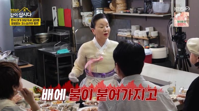 김미령은 "왜냐하면 배에 불이 붙었다. 불이 확 올라오는 곳에서 국수를 삶는데 배가 나와 거리가 멀어지니까 가까이 가다가 앞치마에 불이 붙었다. 오죽하면 주변에서 손님들이 제발 그만 나오라고 했다. 그렇지만 낳는 날까지 끝까지 일을 했다"고 말했다.