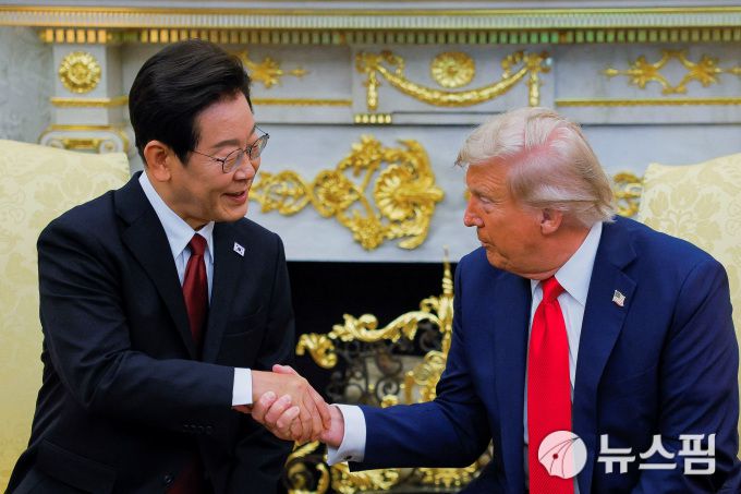 [워싱턴 로이터=뉴스핌]김근철 기자=이재명 대통령과 도널드 트럼프 미국 대통령이 25일(현지시간) 백악관에서 정상회담을 시작하면서 악수하고 있다. 2025.08.26 kckim100@newspim.com