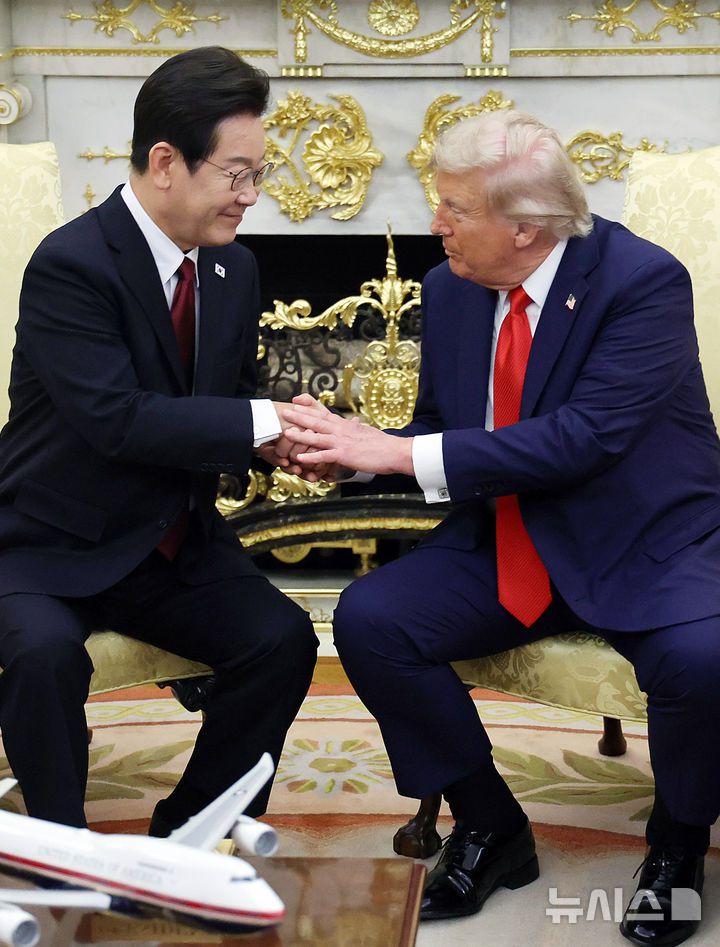 [워싱턴=뉴시스] 고범준 기자 = 이재명 대통령과 도널드 트럼프 미국 대통령이 25일(현지 시간) 미국 워싱턴DC 백악관에서 한미 정상회담을 하며 악수하고 있다. 2025.08.26. bjko@newsis.com
