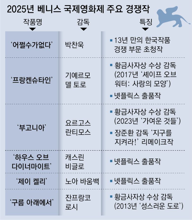 박찬욱 감독의 차기작 ‘어쩔수가없다’가 경쟁 부문에 초청된 제82회 베니스 국제영화제가 27일(현지 시간) 이탈리아 베네치아 리도섬에서 막을 올린다.