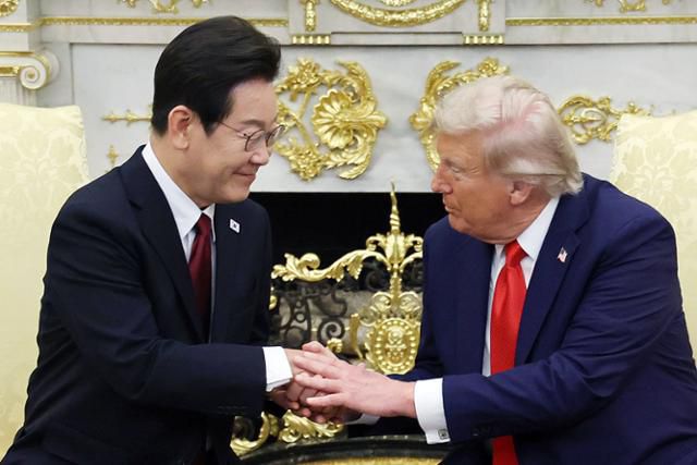 이재명 대통령과 도널드 트럼프 미국 대통령이 25일(현지시간) 미국 워싱턴 백악관에서 한미 정상회담을 하며 악수하고 있다. 워싱턴=뉴시스 |