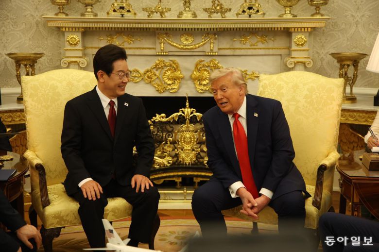 이재명 대통령이 25일(현지시간) 미국 워싱턴DC 백악관 오벌 오피스에서 도널드 트럼프 미국 대통령과 한미정상회담을 하고 있다. 워싱턴=송은석 기자 silverstone@donga.com    송은석 기자 silverstone@donga.com